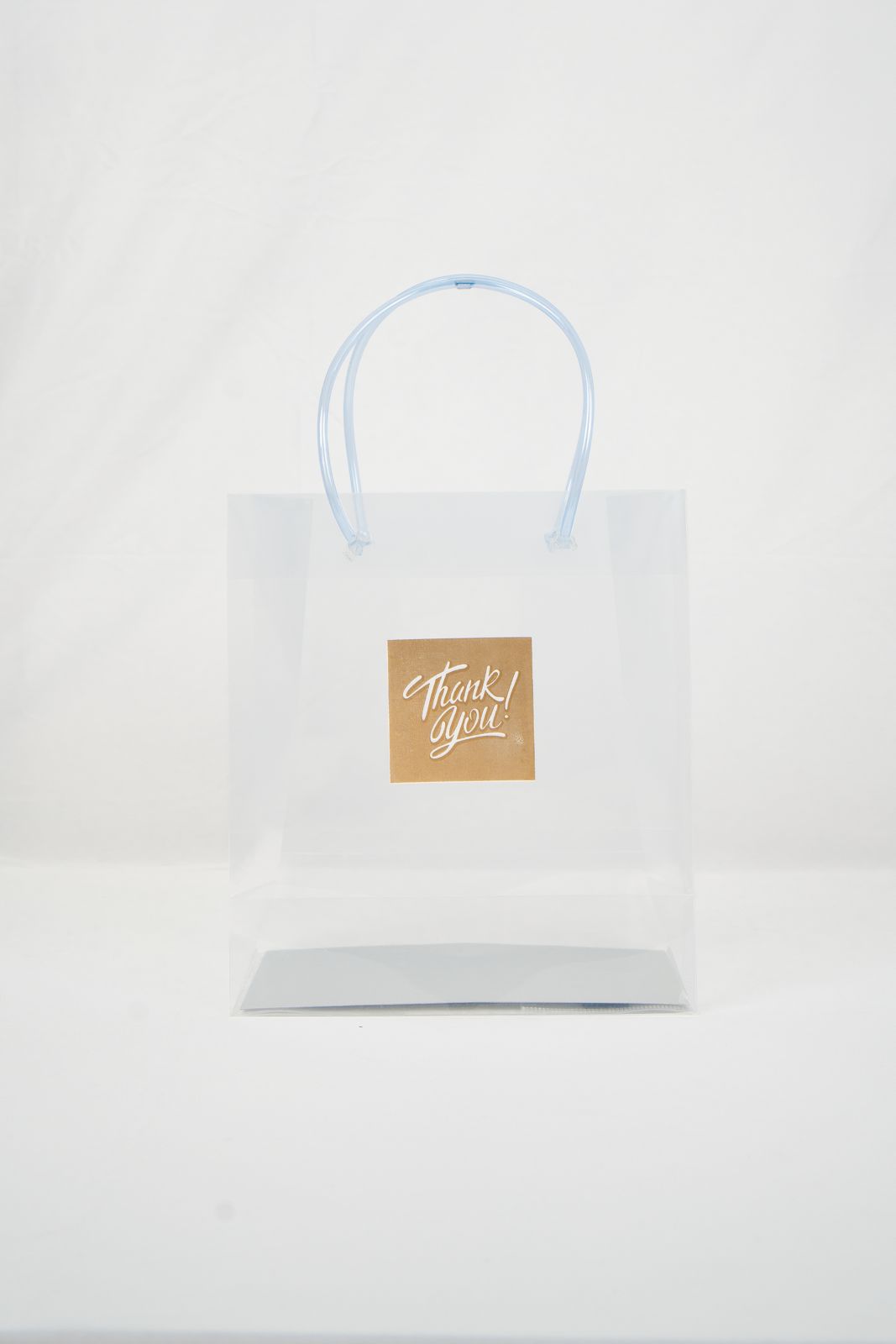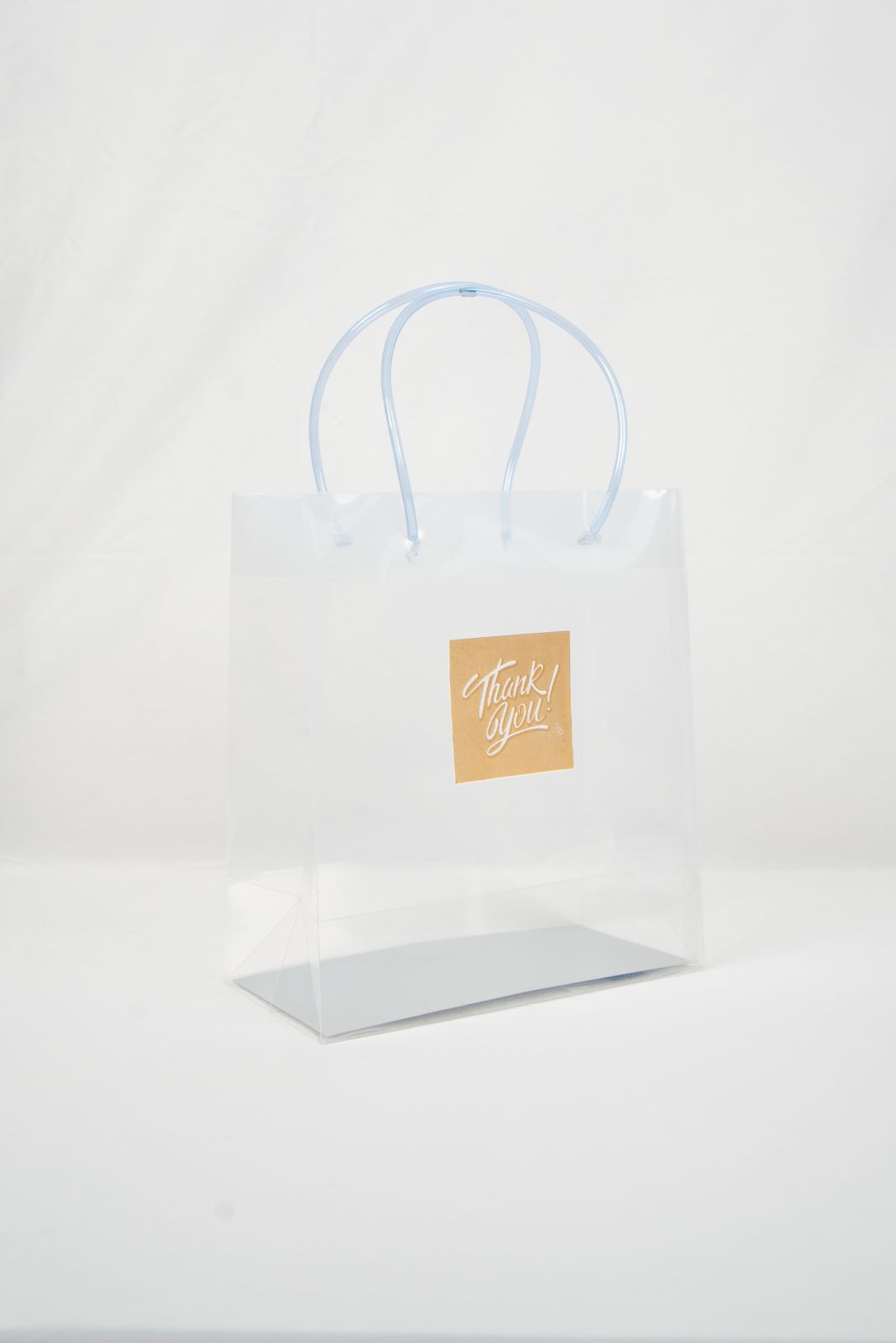 A stylish and reusable transparent gift bag featuring a minimalist “Thank You” design on a kraft paper label. Durable, lightweight, and equipped with clear blue handles, it’s perfect for gifts, party favors, or special occasions.